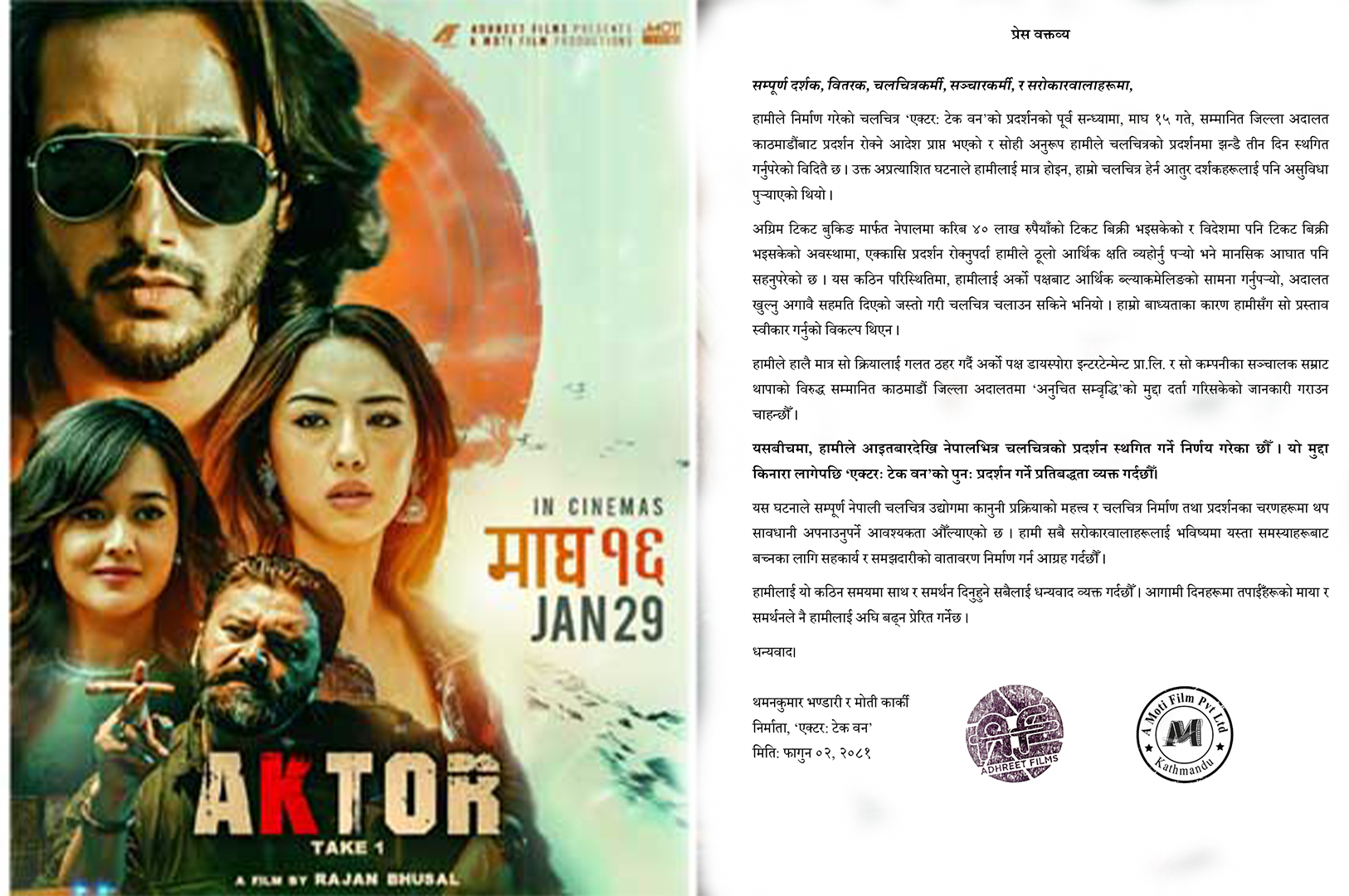 निर्माताद्वारा ‘एक्टर: टेक वन’को प्रदर्शन स्थगित, ‘एक्टर’का निर्माता विरुद्ध अदालतमा मुद्दा सबै पढ्नुहोस् »