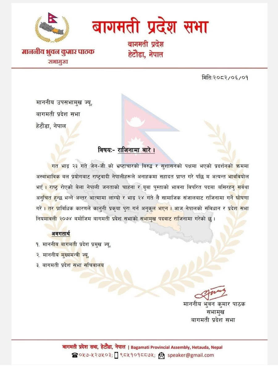 पाेखरा । बागमती प्रदेशसभाका सभामुख भवनकुमार पाठकले पदबाट यसअघि नै दिएकाे राजीनामाकाे पत्र उपसभामुखलाई बुझाएका छन् ।
