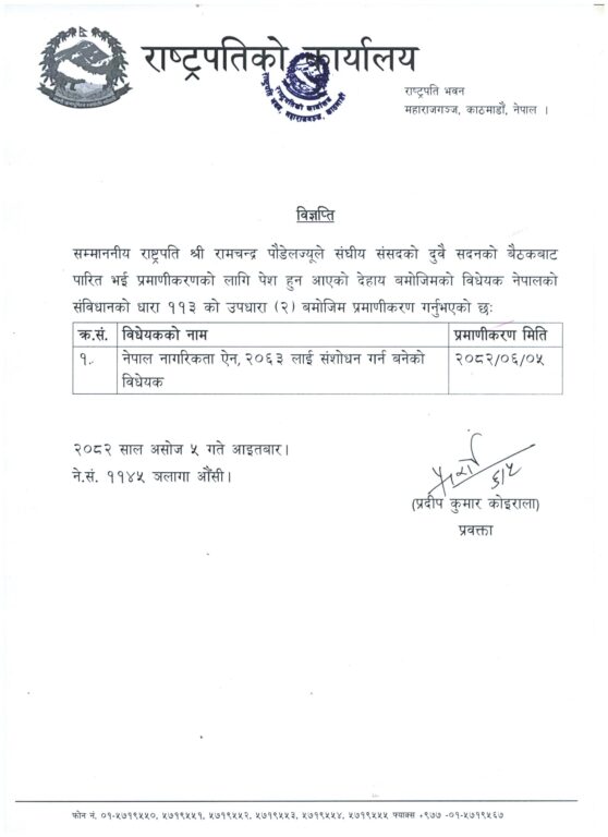 काठमाडौँ। राष्ट्रपति रामचन्द्र पौडेलले संघीय संसदको दुवै सदनको बैठकबाट पारित भई प्रमाणीकरणको लागि पेश भएको नेपाल नगारिकता ऐन, २०६३ लाई संशोधन गर्न बनेको विद्येयक प्रमाणीकरण गरेका छन् ।