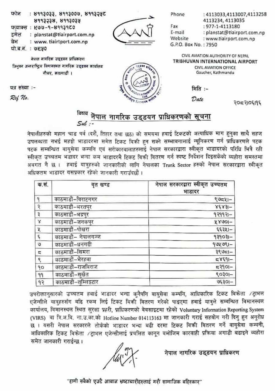 दशैँ, तिहार तथा छठको समयमा हवाई टिकटको अत्यधिक माग हुनुका साथै सहज उपलब्धता नभई महँगोमा भाडादरमा समेत बिक्री हुन सक्ने सम्भावनालाई न्यूनीकरण गर्ने भन्दै क्यानले देशभित्रका विभिन्न स्थानको अधिकतम भाडादर सार्वजनिक गरेको जनाएको छ ।