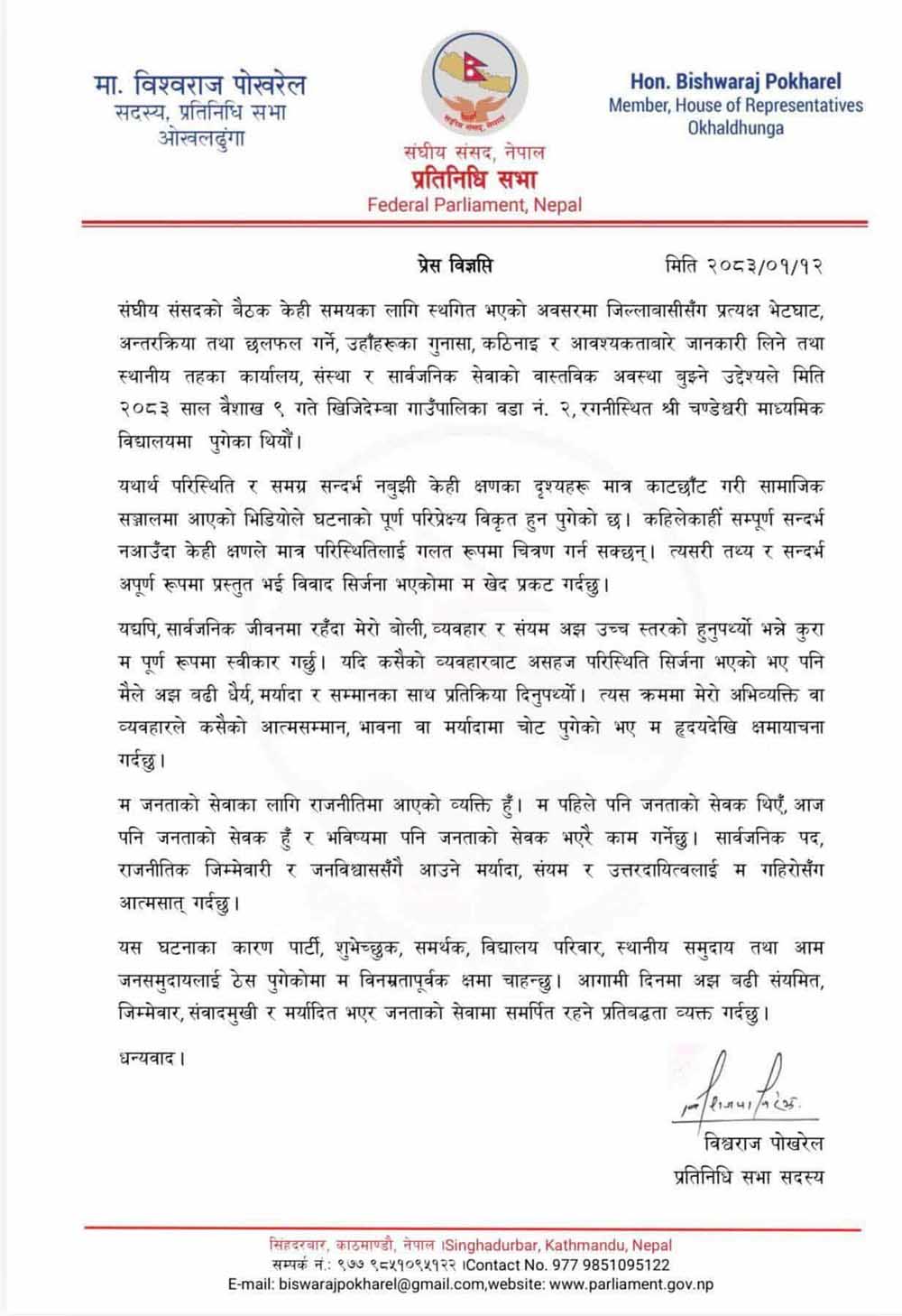 विद्यालय घटनाको चर्को आलोचना भएपछि सांसद पोखरेलले मागे माफी [विज्ञप्ति]